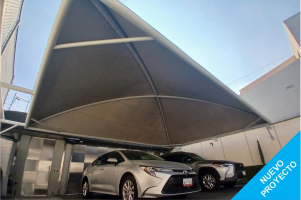 Proyecto de diseño e instalación de una cubierta para garage en Fuentes de Satélite, concebida para proteger vehículos de la exposición solar y la lluvia, al mismo tiempo que se integra de forma estética con la arquitectura residencial.