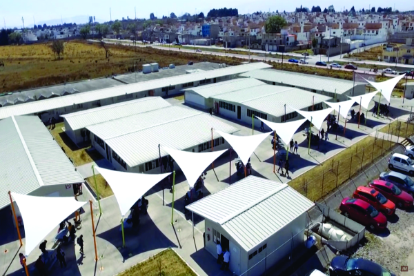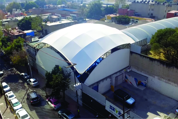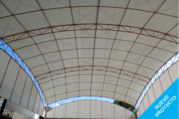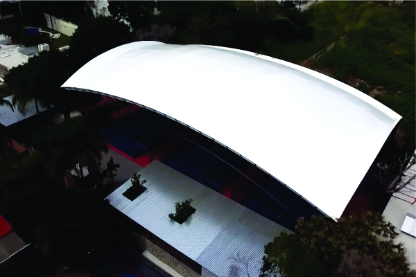 Cubierta para espacio libre en Colegio Cedros diseñada con estructura ligera de acero y sistema de techado de alto desempeño, que proporciona protección contra radiación solar y precipitación sin comprometer la ventilación natural ni la iluminación difusa. Integra soluciones de drenaje pluvial, resistencia a cargas de viento y bajo mantenimiento, optimizando la durabilidad y funcionalidad del área recreativa.
